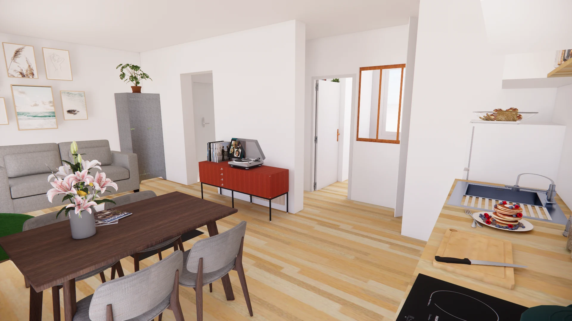 Le brief client : créer une pièce vie agréable notamment assez spacieuse pour installer un tapis de yoga, un canapé lit, recevoir des amis, une chambre avec des rangements.