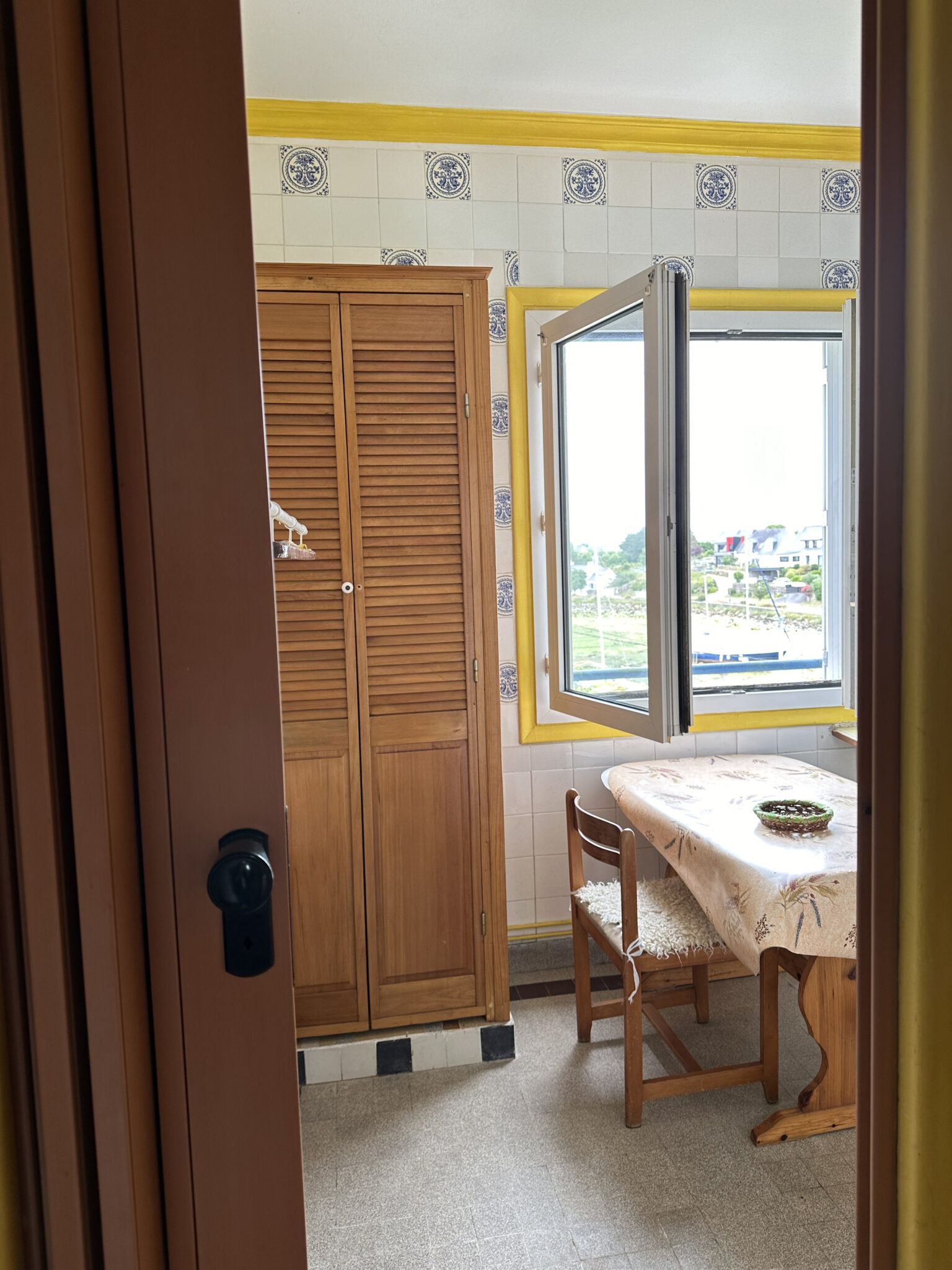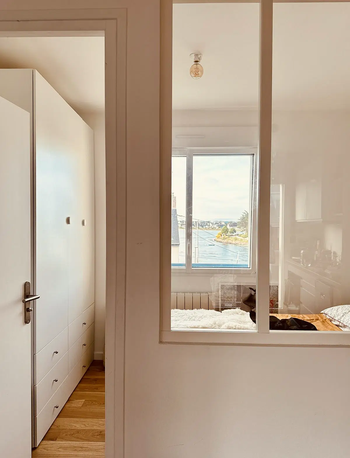 Défi relevé : Parce que parfois dans les projets de rénovation lors de la phase démolition on fait tomber plus de cloisons que prévu. C’était le cas pour ce projet qui au départ ne devait pas engager trop de travaux de démolition. La version 1 du projet reprenait en partie les espaces existants, la démolition plus ambitieuse a permis de repartir sur un plateau vierge et de créer une belle pièce de vie sur la partie sud avec les deux baies vitrée, tout en créant une petite chambre optimisée dans l’ancienne cuisine. Le plus on a créé un petit coin buanderie .
