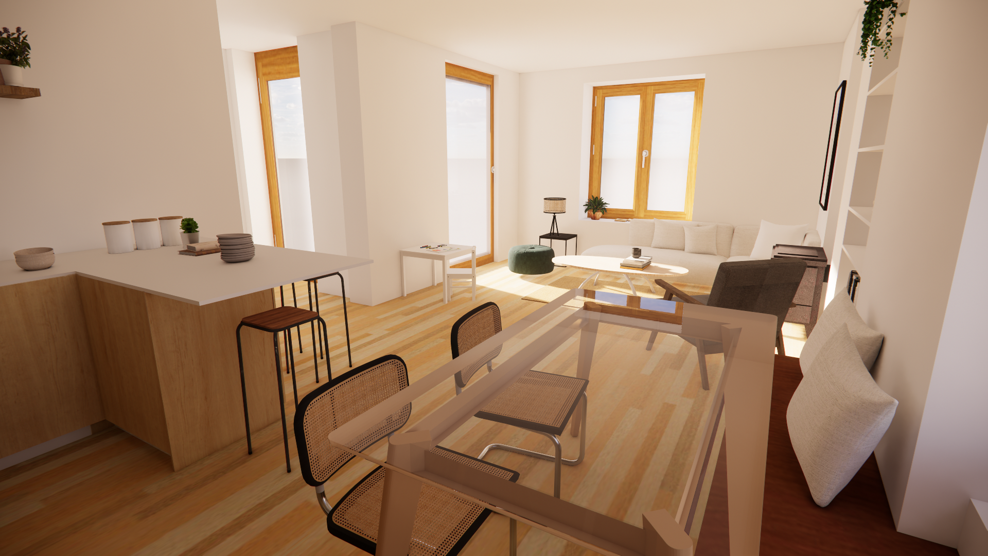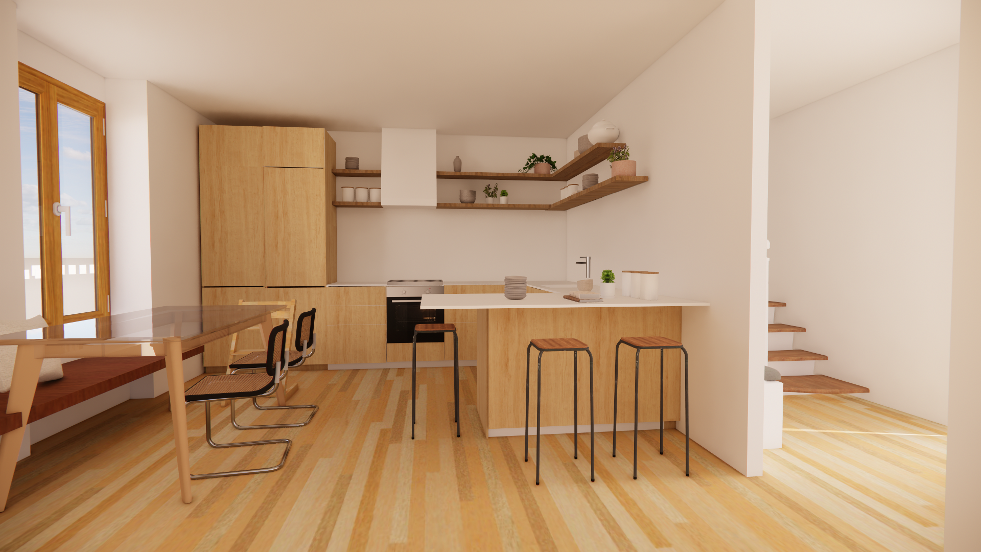 Brief client : les clients savaient où mettre leur cuisine mais ils souhaitaient être aidés pour trouver l’agencement optimal et la répartition des différentes fonctions. Le dilemme était aussi l’équilibre entre l’emplacement d’un bar au niveau de la cuisine , et le souhait d’avoir aussi une table pour recevoir sans en préservant un espace canapé confortable.
