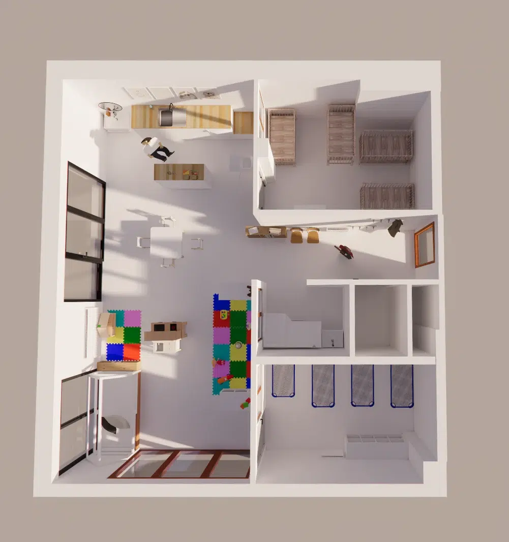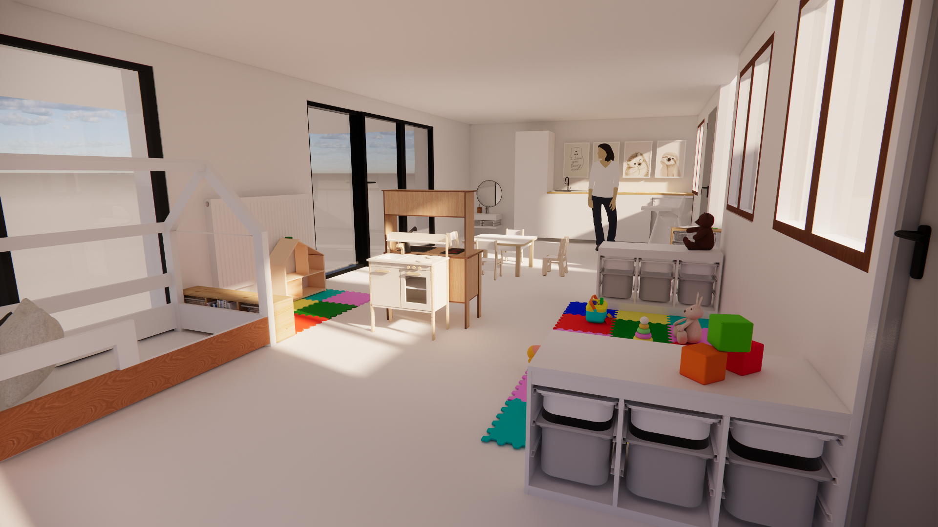 Aménagement d ‘une maison d’assistante maternelle. Définir les espaces sur la base d’activités et la circulation en prenant en compte les besoins spécifiques de la profession et contraintes les contraintes réglementaires.